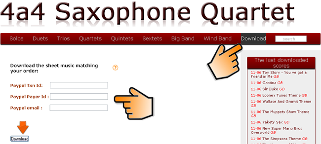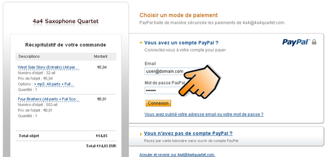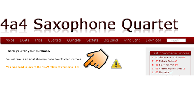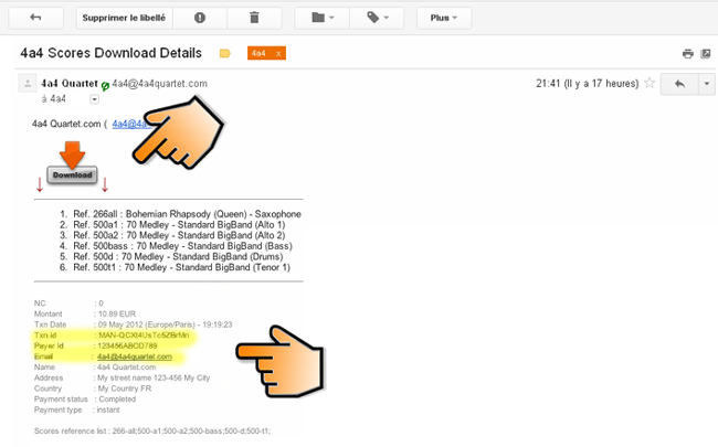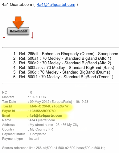 | 1 | Question #1 How to order and receive my scores? | ![]() Be careful, a frequent error comes from the email address you use with your Paypal account. Sometime this email address is different from the one you use every day (ex: personal address vs. professional address). Don't forget to check the right email box. All scores are sent to the email address you've used with Paypal. Don't forget to take a look at your "SPAM" folder. The email is sent few minutes after the checkout. If after one hour, you have not received any email, just tell us. An invoice (to the owner of the Paypal account) is provided with every order. You can use it for example to be refunded by your music school. |